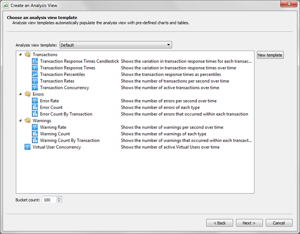 You can define a new analysis view template from this page of the wizard by clicking New template on the right side of the window. To read about the Create Analysis Template wizard, see Analysis Templates in Eggplant Performance Analyzer.