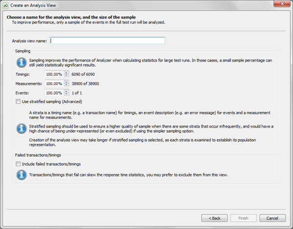If your test run contains a large number of transactions and timings, you might want to include only a percentage of them in the analysis view. The accuracy of some calculations is reduced but sampling when faced with large amounts of data is a valid statistical method and can improve Analyzer performance.