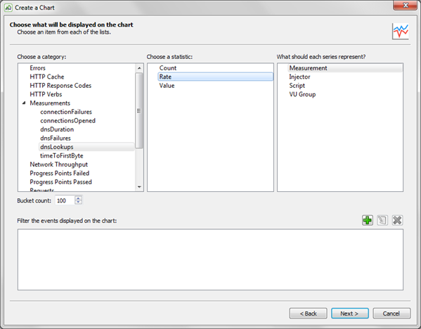 - Set the Bucket count. This setting limits the number of transactions that are plotted across the x-axis of a chart to the number set by the "bucket." Within each bucket, or division, all the data is averaged to provide the data that gets plotted on the chart. Setting a lower number can speed processing time as well as smoothing some of the peaks and valleys on your charts because you'll be working with fewer data points. The default bucket count is 100; enter a new number in the field if desired. (To change the default value, go to Tools > Preferences.)