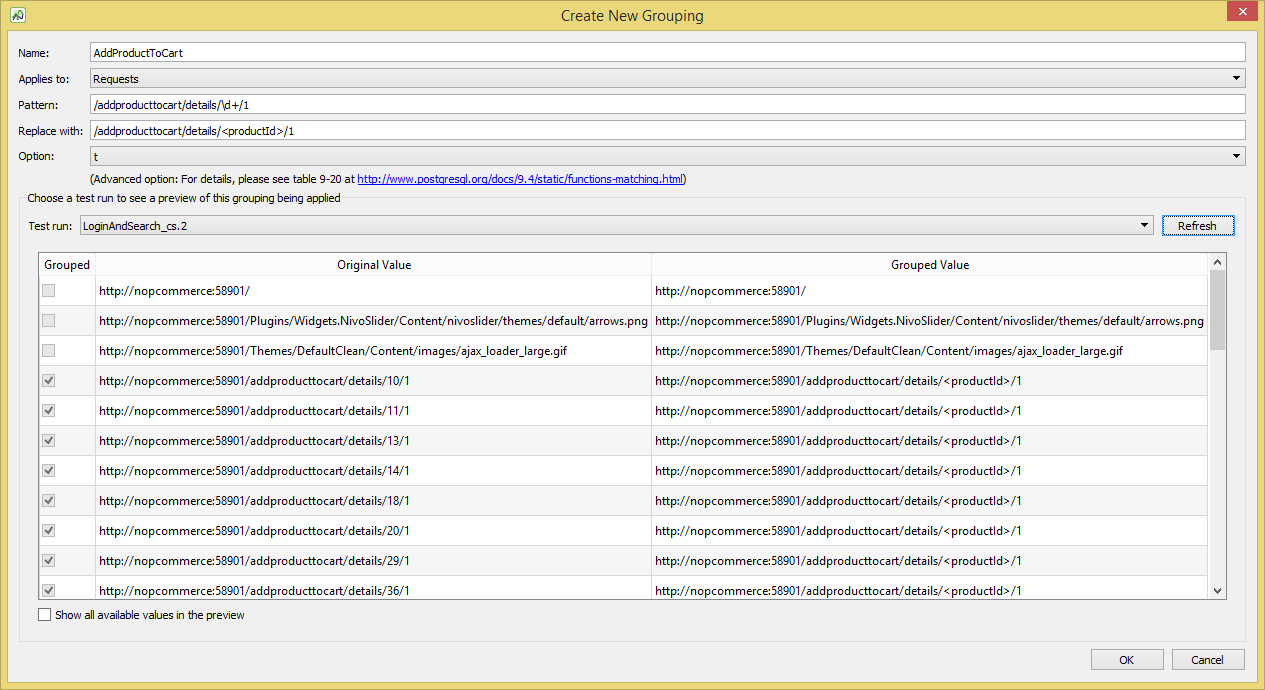 The regular expression /addproducttocart/details/\d+/1 matches all of the requests with dynamic product IDs. It checks for one or more digits between the sequence /addproducttocart/details/ and /1. All requests that match this pattern become grouped as indicated by the checkbox to the left, and will instead display as http://nopcommerce:58901/addproducttocart/details/<productId>/1, as shown below: