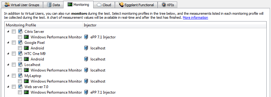 The second column of the tree shows the injector on which the monitor will run during the test.