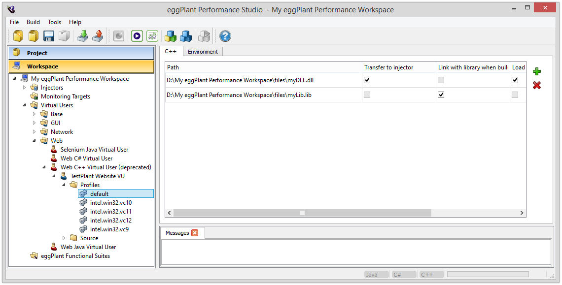 Each custom C++ VU contains a default profile and one or more runtime profiles. The selected runtime profile is determined by the version of Visual Studio chosen in the Compilers and IDEs preferences.