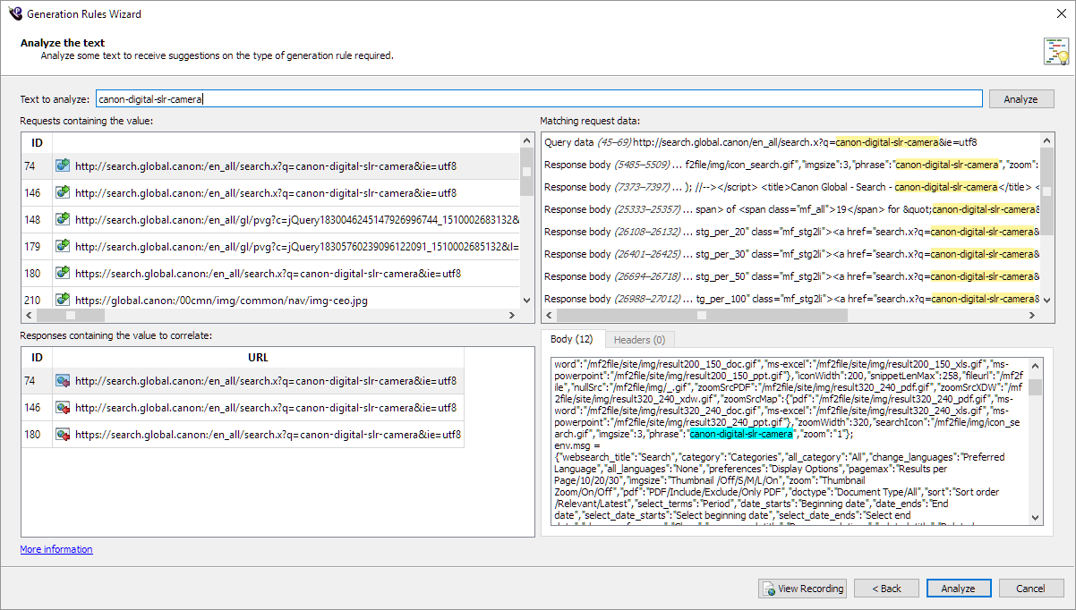 - Click Analyze. The Assistant evaluates the text you entered and where it occurs in the recording, and then displays a message telling you if you need a replace or data correlation rule. In the sample screen above, the Assistant displayed the following message: "The text originated on the server. If the text will be different each time the script is executed, then it will need to be correlated."