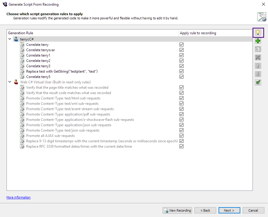 - Either select the custom VU and click Assistant (the light bulb button) to create a new generation rule, or select an existing rule and click Assistant. The Script Generation Rules wizard opens to the Select the correlation basis page.