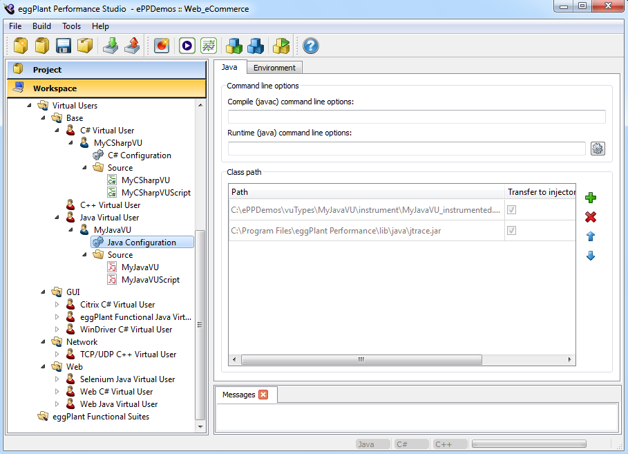 Expand a Java custom virtual user (VU) in the Workspace tree to display the configuration options. This will open the configuration options view: