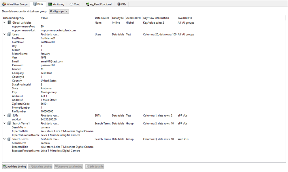 - Test level: Data sources bound at this level are accessible to all virtual user groups for that test. Note, however, that when you create a data binding, you can choose to include only select VU groups.