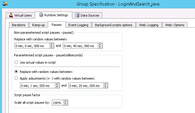 Script pauses can be adjusted on the Pauses tab of Runtime Settings. The pause() function is used by Eggplant Performance in scripts to halt its execution temporarily. The function can be passed a time value (in milliseconds) or left blank. Pauses are often referred to as user think-time.