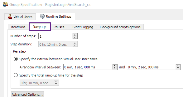 The Runtime Settings Ramp-up lets you determine intervals between VU start times as a test begins: