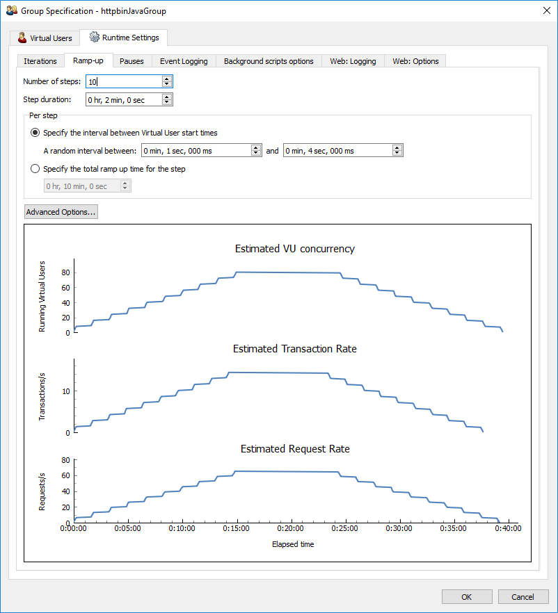 - Number of steps: This setting sets the number of steps over which all the VUs are ramped-up. Each step ramps-up x many VUs, based on the total number of VUs in the group and the time specified between each step (Per step settings) that you configure.