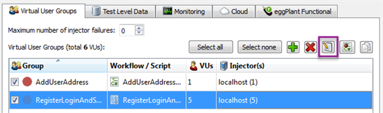 To edit a virtual user (VU) group, select the VU group from the Virtual User Groups tab in the test view and click the Edit button: