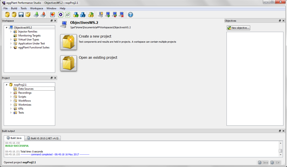 This section shows the progress when you build the project, including any errors and warnings. You will see a tab for each virtual user type in the project, although all types are built at the same time. This section is empty if you haven't build the project (or haven't built since you launched the application).