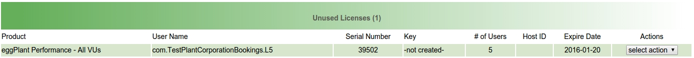 Note: If you are renewing an existing license, you select Renew from the drop-down list in the Actions column. - On the Generate License Key page, enter the host ID for your Eggplant Performance Controller machine in the Host ID field, then click Generate License Key.