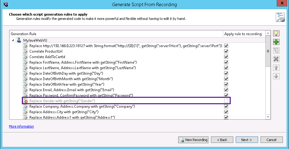 If a rule is disabled and not selected as shown highlighted above, you can still edit it here but you cannot make it available. To make a rule available during script generation you must select it in the custom VU view. See Generation Rule Availability During Script Generation for information about making rules available during script generation.