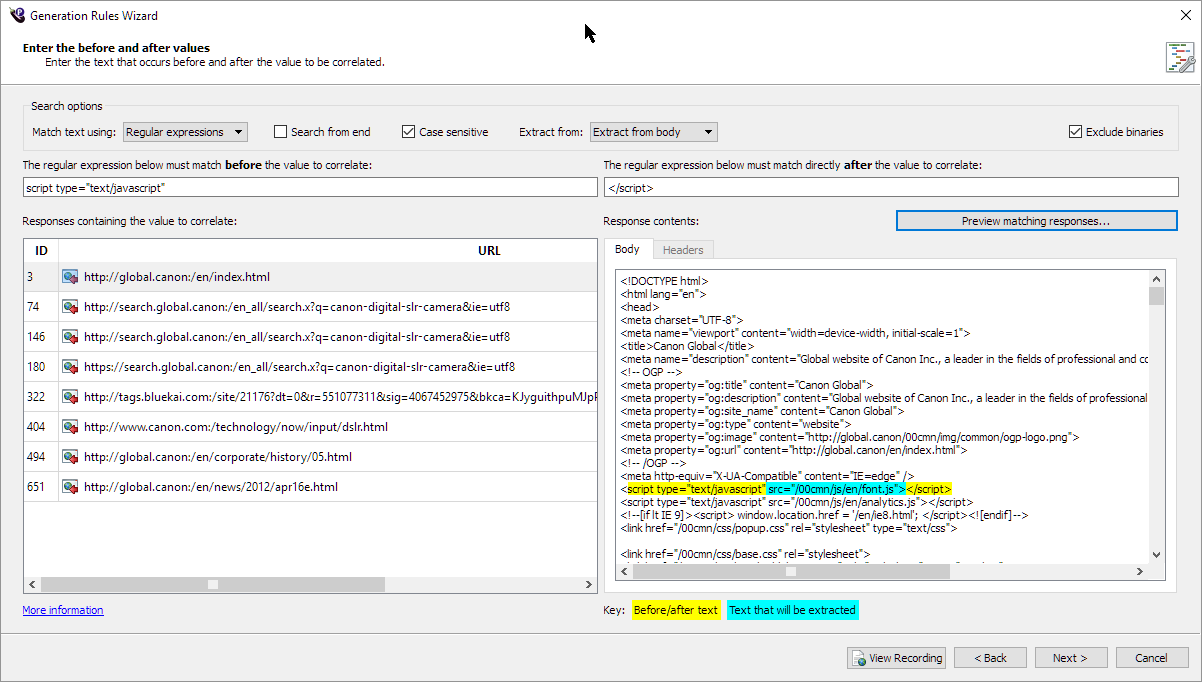 Note: You can use the Extract from and Search case sensitive search options with using text to correlate or regular expressions.Extract from: This option helps to narrow down from which part of the HTTP response to extract a value. This is useful in case the before/after values are too general, or if you only want to make sure matches are only found in headers or cookies. The Response contents box is divided into Body and Headers tabs to help distinguish from where values should be extracted.