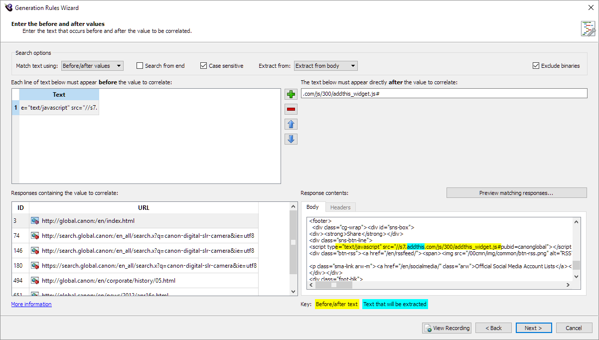 - To use the text you entered on the Text to correlate page, select Before/after values in the Match text using drop-down menu. You can enter one or more lines of text in the before and after boxes.