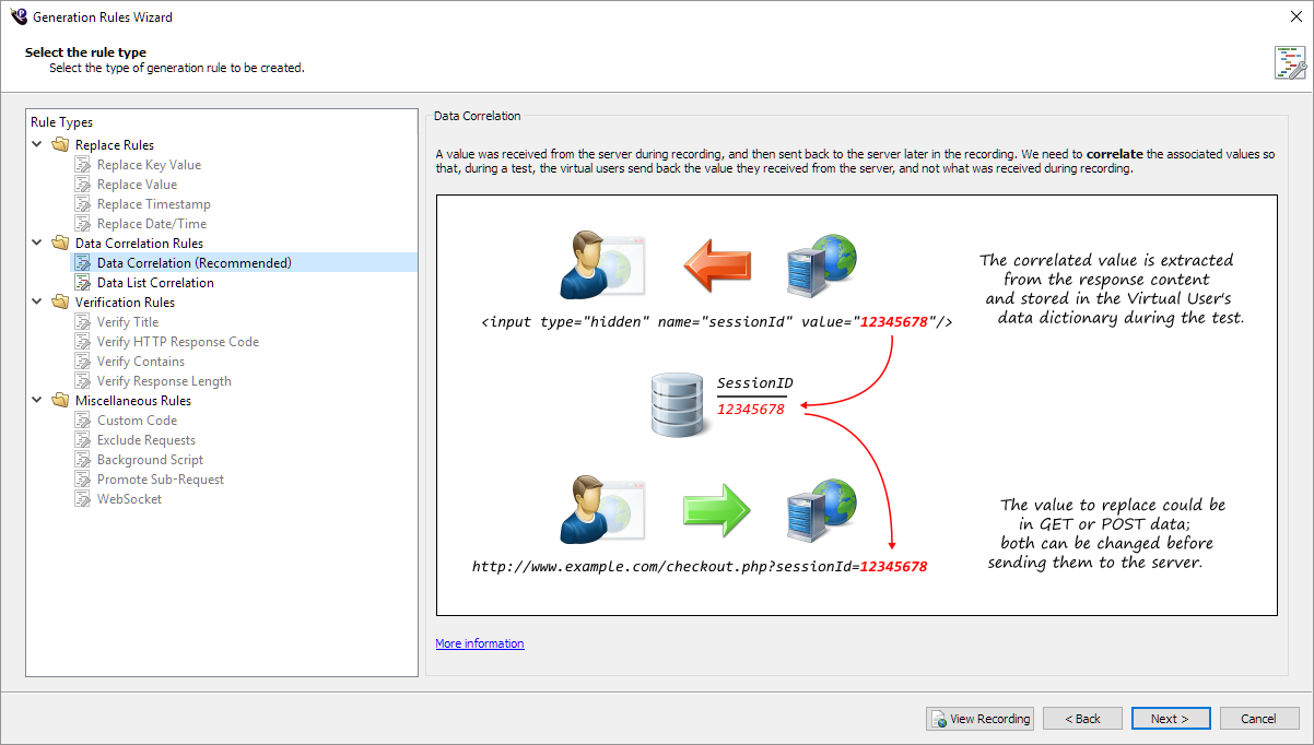 The Data Correlation rule is similar to the Replace Value rule, but the replacement value is extracted from a response at runtime and placed into the VU's data dictionary, and the Data Correlation rule uses a variable name. See Enter variable name, and success/failure options for more information about the variable name.