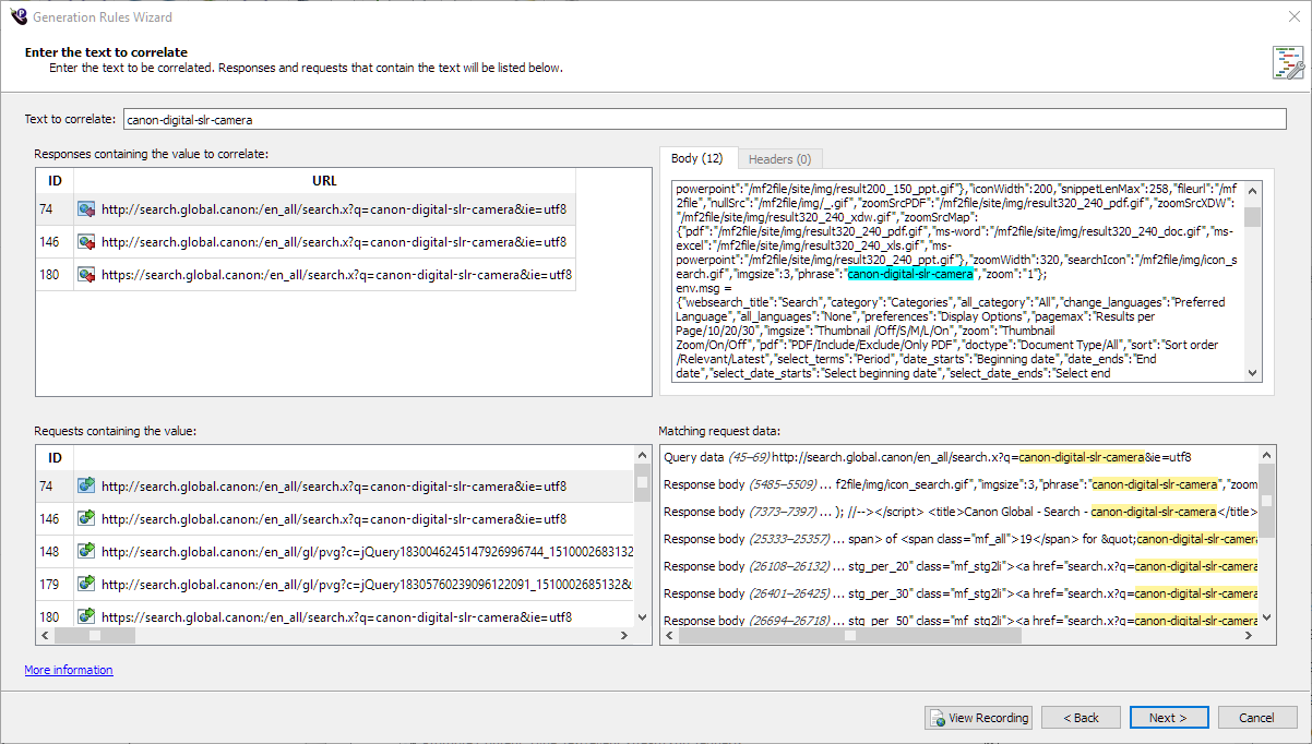 The tables display responses and requests (in the current recording) that contain the text to correlate you entered. You can select a response or request in the table to show its contents in the box on the right-hand side, with the text to correlate highlighted.