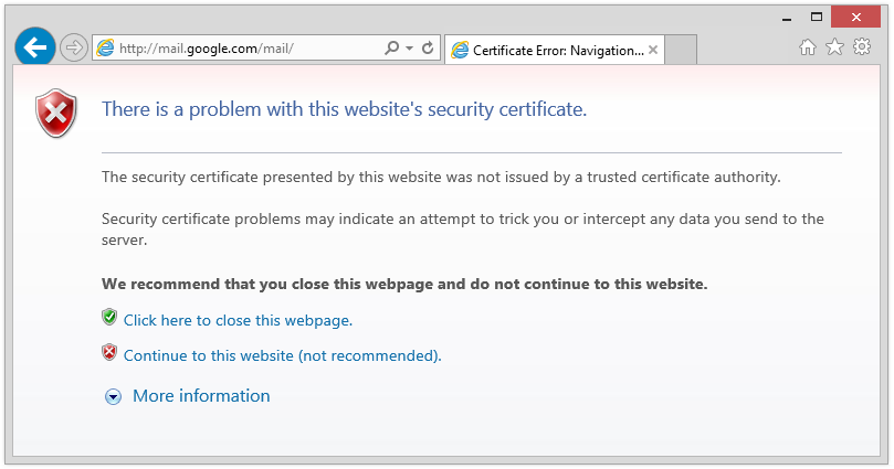If the root certificate is not installed or trusted, your browser displays messages such as There is a problem with this website's security certificate. You can continue to the website, but any requests sent using HTTPS won't be recorded, and won't be sent when a virtual user runs the generated script. If your System Under Test relies on HTTPS, you must rectify this issue.