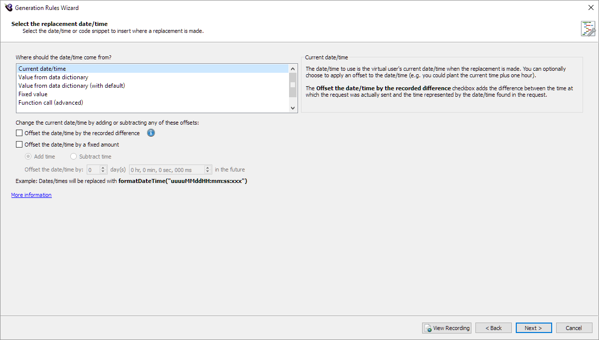 Value from data dictionary: The date/time in the recording is replaced by a value retrieved from an external data file, based on a key entered in the Data key field. With this method, each virtual user in the test can retrieve a different value at runtime.