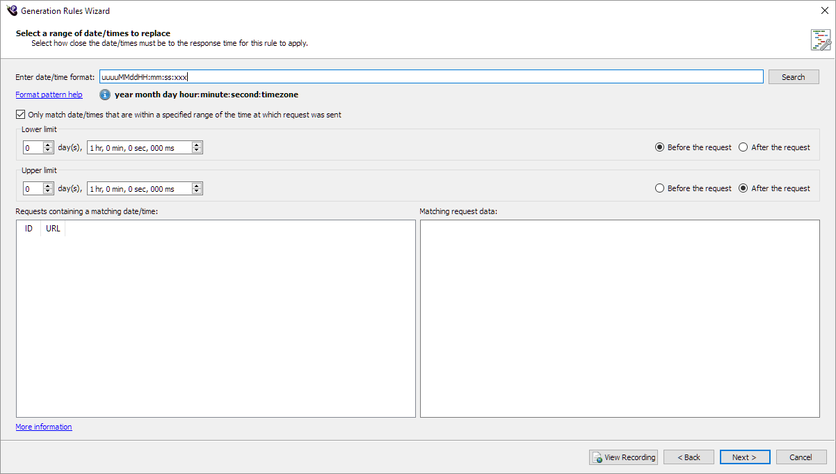 The Requests containing a matching date/time section shows any requests (in the current recording) that contain date/times in the indicated range so that you can see which requests will be affected in the generated script. If you select a request in the list, the Matching request data box shows details about the match.