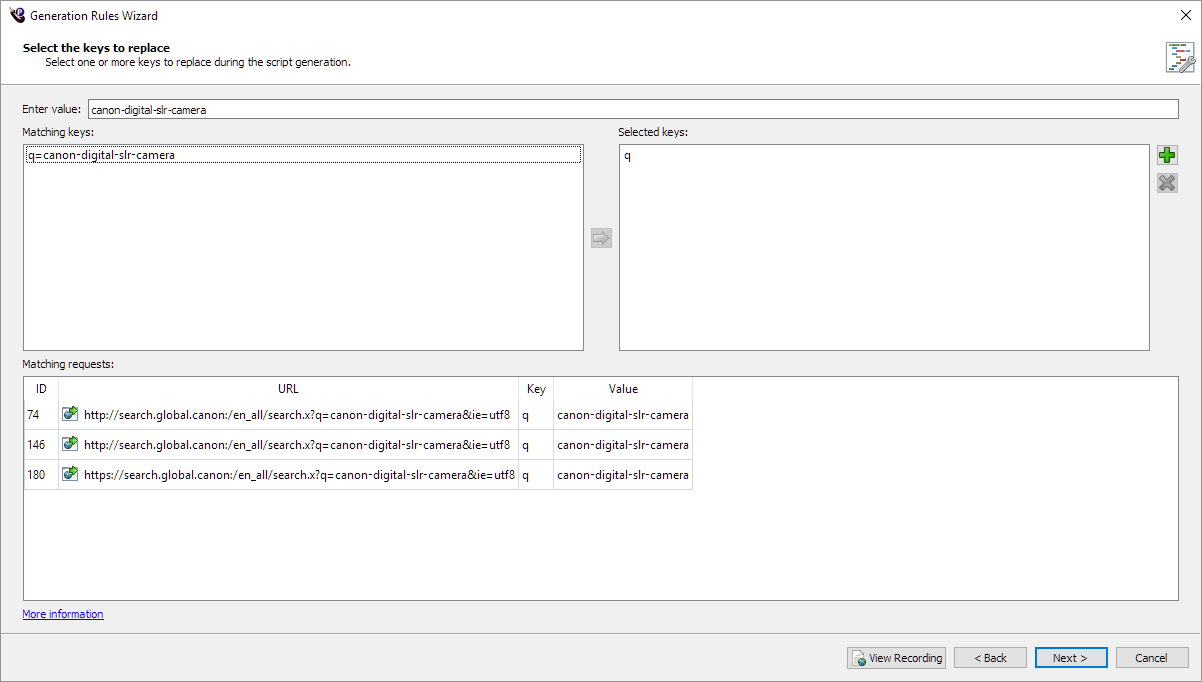 The Matching requests table shows any requests (in the current recording) which sent GET or POST data containing any of the keys in the Selected keys list. This is so you can see which requests will be affected in the generated script.