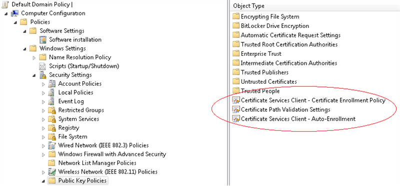 The Configuration Model drop down list on the Certificate Services Client - Auto-Enrollment Properties must have Enabled selected