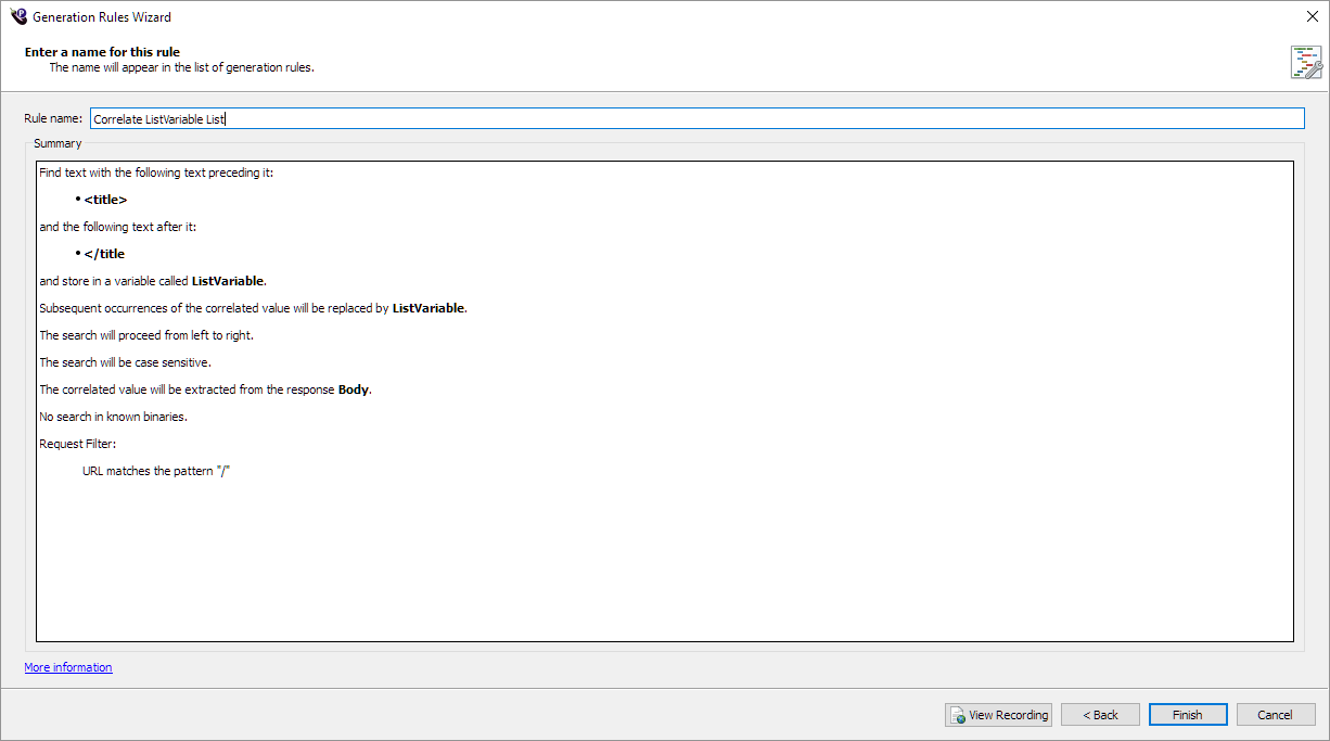 The Enter a name for this rule page is the final page in the Generation Rules wizard. This page provides a summary of the rule, and a field for you to enter a name for the rule. The wizard suggests a name for you in the Rule name field. But you can change it to something more meaningful if necessary.