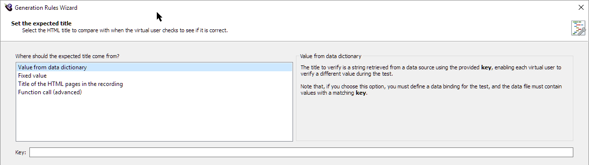 The title to verify is a string retrieved from a data source using the provided key, which enables each VU to verify a different value during the test. For information about VU data dictionaries, see The Virtual User Data Dictionary. You must enter a value here to proceed through the wizard.