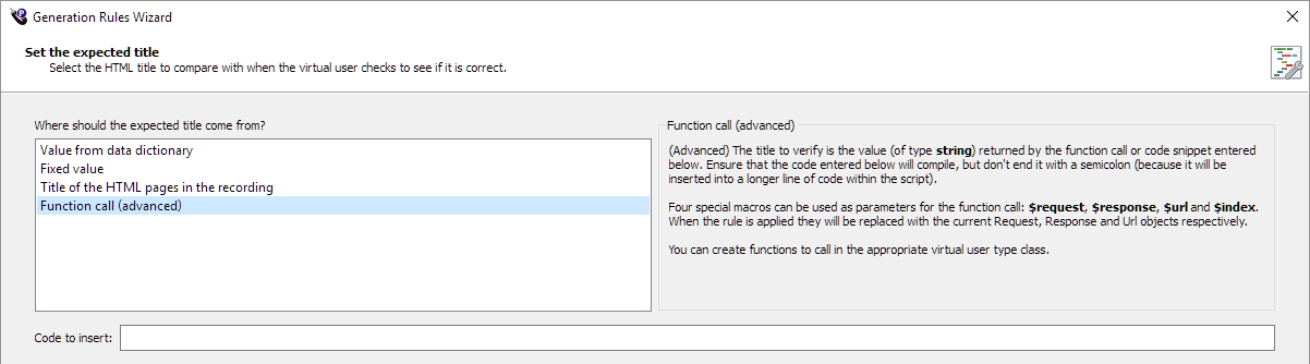 Function call (advanced): If you select Function Call, the Set the expected title page changes to provide a Function call field for you to enter a function call. You must enter a value here to proceed through the wizard.