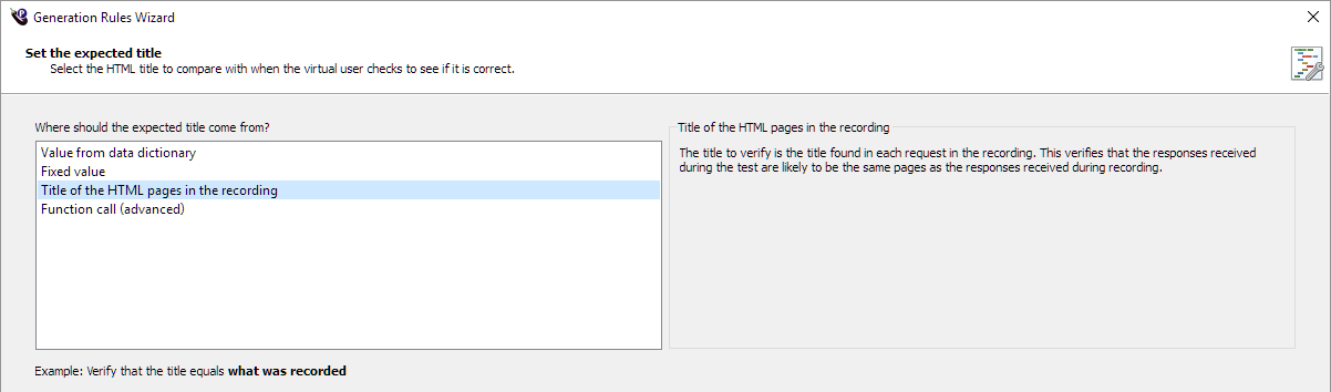 Title of the HTML pages in the recording: This option verifies that the server is returning the same pages (if they have the same title) as the responses received during recording. If you select this option, you do not need to enter any information. You can proceed through the wizard.