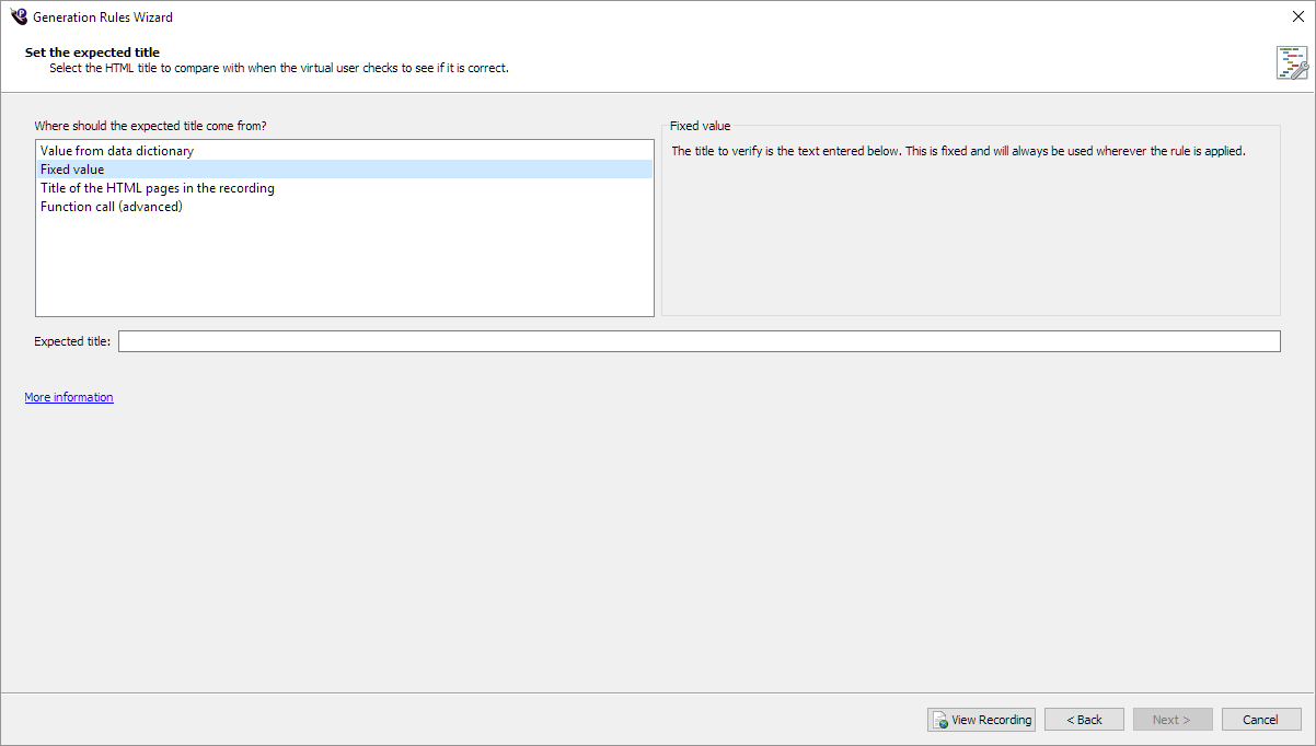 Fixed value: If you select this option, the Set the expected title page changes to provide a Fixed value field for you to enter the value you want. You must enter a value here to proceed through the wizard.