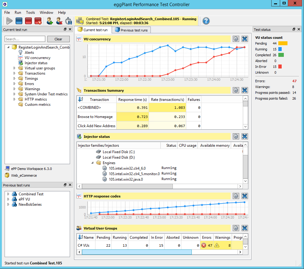 The Eggplant Performance Test Controller user interface (UI) is where you run and monitor your performance tests. Here you will find: